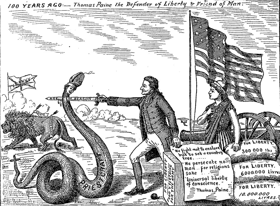 The following shows over 100 political cartoons of Thomas Paine. Some positive and many negative, the cartoons, paintings, sketches and more are a vivid example of how Paine’s enemies in the British monarchy, with it’s ruthless propaganda machine, and some anti-democracy Americans too attacked Paine in print. Supporters also fought back with some of their own, as you will see. If you have found other political cartoons that should be included in our collection, please get in touch with us at info@thomaspaine.org . Click the images to enlarge.