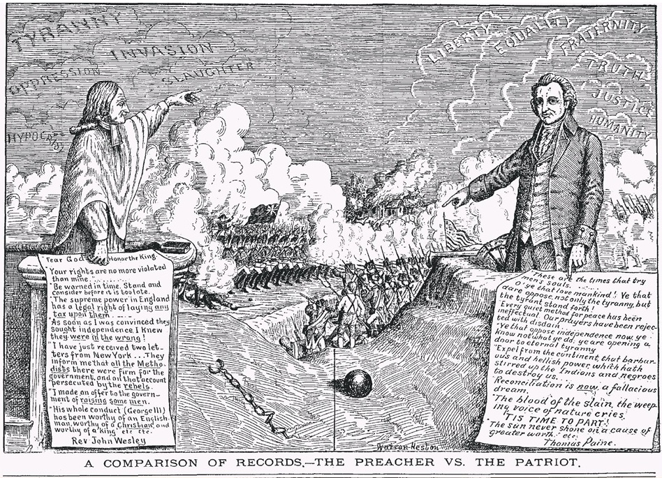 1777 political cartoon titled “Poor old England endeavoring to reclaim his wicked American children ” shows a man representing England tries to hold on to five Americans on the other side of the Atlantic Ocean. The American in dark pants is believed to be Paine – © The Trustees of the British Museum 1780’s anonymous cartoon titled “Le Fameux Empyrique Anglois American ” (The Famous English American Empiric/Quack) shows Paine, as medicine man, standing on a podium in front of an audience and promoting his bottle labeled “Union” to a crowd of on-lookers – American Philosophical Society “Zion besieg’d and attack’d ” is a 1787 American political etching sold by Philadelphia bookseller William Poyntell showing a large citadel besieged by a host of characters including the “Bankers Corps”, Thomas Paine and other politicians an the assault against the 1776 Pennsylvania Constitution. Atop the citadel stands a lone Native American holding a shield and a long spear and facing a host of winged creatures – Library of Congress A 1790 political cartoon titled “The Repeal of the Test Act, a Vision ” by James Sayers. Paine appears under the foot of Lord Stanhope – National Portrait Gallery, UK “Contrasted Opinions of Paine’s Pamphlet ” is a 1791 intaglio by Frederick George Byron. Eight public figures are depicted reading excerpts from Rights of Man and reacting to them. Charles James Fox, Richard Brinsley Sheridan and Mary Wollstonecraft are the three supporters of Paine’s writings while the rest deplore them – American Philosophical Society “Mr Burke’s pair of spectacles for short sighted politicians ” a 1791 etching by James Sayers shows Edmund Burke targeting Paine assisted by Richard Brinsley Sheridan and a demon-riding Joseph Priestley, preparing to strike a symbol-laden tree with an ax inscribed “Rights of Man”. An open copy of Rights of Man sits among other books nearby – © The Trustees of the British Museum “A Democrat ” is a 1791 intaglio by George Moutard Woodward. A French patriot, standing near a lamp-post hung with a noose and a decapitated head, Paine’s Rights of Man in his pocket. – American Philosophical Society “Revolution Anniversary, or Patriotic Incantations ” is a 1791 intaglio by William Dent. Four figures dance around a cauldron before the anniversary of the fall of the Bastille. Chemist Joseph Priestly is holding Rights of Man and invoking the spirit of Thomas Paine – American Philosophical Society “The Rights of Man: or Tommy Paine, the little American Taylor taking the measure of the Crown, for a new pair of Revolution Breeches ” a 1791 political cartoon by James Gillray. It depicts Paine as a “little American Taylor” who is taking the “measure of the Crown” to create a new pair of “Revolution Breeches” – National Portrait Gallery, UK “Published by Order of the Society for Constitutional Information by D. A-s [Adams] Secrety ” a 1791 intaglio by James Sayers showing Daniel Adams, secretary for the Society for Constitutional Information, a political group in late 18th-century England, depicted as an ass braying “Rights of Man” and carrying panniers filled with Paine’s works. To the side, the British Lion holds open a book by Burke – National Portrait Gallery, UK “Mad Tom, or the man of rights ” a 1791 etching of Paine sitting on a paper inscribed ‘Rights of Man’. The paper on his desk is inscribed: ‘Riots, treasons, Plots, conspiracies, civil war – Burk’ – © The Trustees of the British Museum A political cartoon titled “Tom Paine’s Nightly Pest ” created by James Gillray in 1792. Paine dreams of judicial wigs, a dungeon and a gibbet, and his coat pocket, lying across the bed, contains a copy of ‘Common Sense’ except that the alternative title of ‘Common Sense is or convincing Reasons for Britons turning Sans Culottes’ – © The Trustees of the British Museum A 1792 political cartoon titled “Loyalty against levelling ” by James Sayers. Paine sees the sign of the ‘Association for Preserving Liberty and Property against Levellers and Republicans’ while attempting to cut off the sign of a crown with the assistance of Frenchmen. In his pocket are works by Chemist Joseph Priestley and his own Rights of Man – National Portrait Gallery, UK “Vices overlook’d in the New Proclamation ” is a 1792 political cartoon by James Gillray showing avarice illustrated by the King and Queen hugging bags of money, drunkenness by an inebriated Prince of Wales, gambling by the Duke of York at a gaming table, and debauchery by the Duke of Clarence and Mrs. Jordan embracing. A satire on the Royal Proclamation of 21 May, which was directed chiefly against Paine’s writings – American Philosophical Society “A Sure Cure for all Paines ” or “The Rights of Man has got his Rights” is a 1792 political cartoon showing Paine being hung – American Philosophical Society “What Wants Me ?” a 1792 political cartoon by an unknown artist lampoons Paine’s weaponry for revolution, including treachery, famine, and cruelty – Library of Congress “Mad Tom’s first political essay on the rights of man ” a 1792 satirical etching by Isaac Cruikshank depicting Paine (‘Mad Tom’) as a radical conspirator, burning breeches while plotting revolution with Richard Brinsley Sheridan and Whitbread – © The Trustees of the British Museum “The Unitarian arms ” a 1792 political cartoon attacking Joseph Priestly and Paine in the ‘nests’ of serpents alluding to ‘a late Regulation of the dissenters, under the Direction of Thomas Paine’ – © The Trustees of the British Museum “Constitutional Danger, or, A sure way to stop the progress of Pain ” a 1792 satirical print by William Dent showing William Pitt the Younger firing a cannon mounted on the back of George III from which issue balls of ‘Reform’ that decapitate Paine and his supporters’